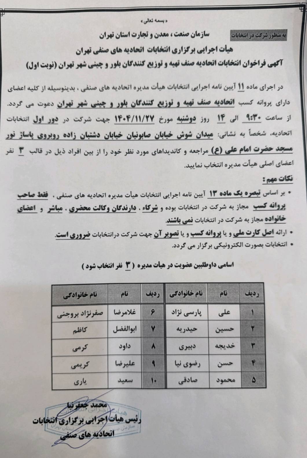 ?? بدينوسيله از کليه همکاران محترم داراي پروانه کسب اتحاديه جهت شرکت در دور اول انتخابات در تاريخ 1404/11/27 از ساعت 9:30 الي 14 دعوت بعمل مي آيد شخصا به آدرس : ميدان شوش خيابان صابونيان خيابان دشتبان زاده روبروي پاساژ نور مسجد امام علي (ع) مراجعه و کانديدا مورد نظر خود را شخصا از بين افراد در قالب 3 نفر از اعضاي اصلي هيات مديرها انتخاب نمايند .